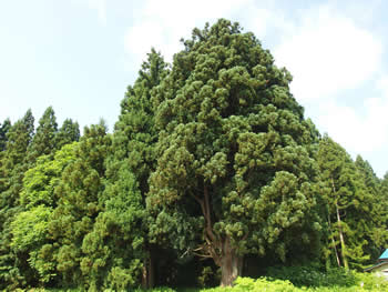 つまり、この一本杉が名木沢七所神社の元宮である。そんなところから当地を投げ沢と呼んでいたと云う。一本杉はその名の如く幹は途中から七本の枝が栄え大きく聳え立ち、威厳を誇っている。また、この杉は神代杉とも云われ、神の木として崇められ枝一本でも切れば罰があたると言い伝えられている。周辺マップ (金山町・西田 徹)